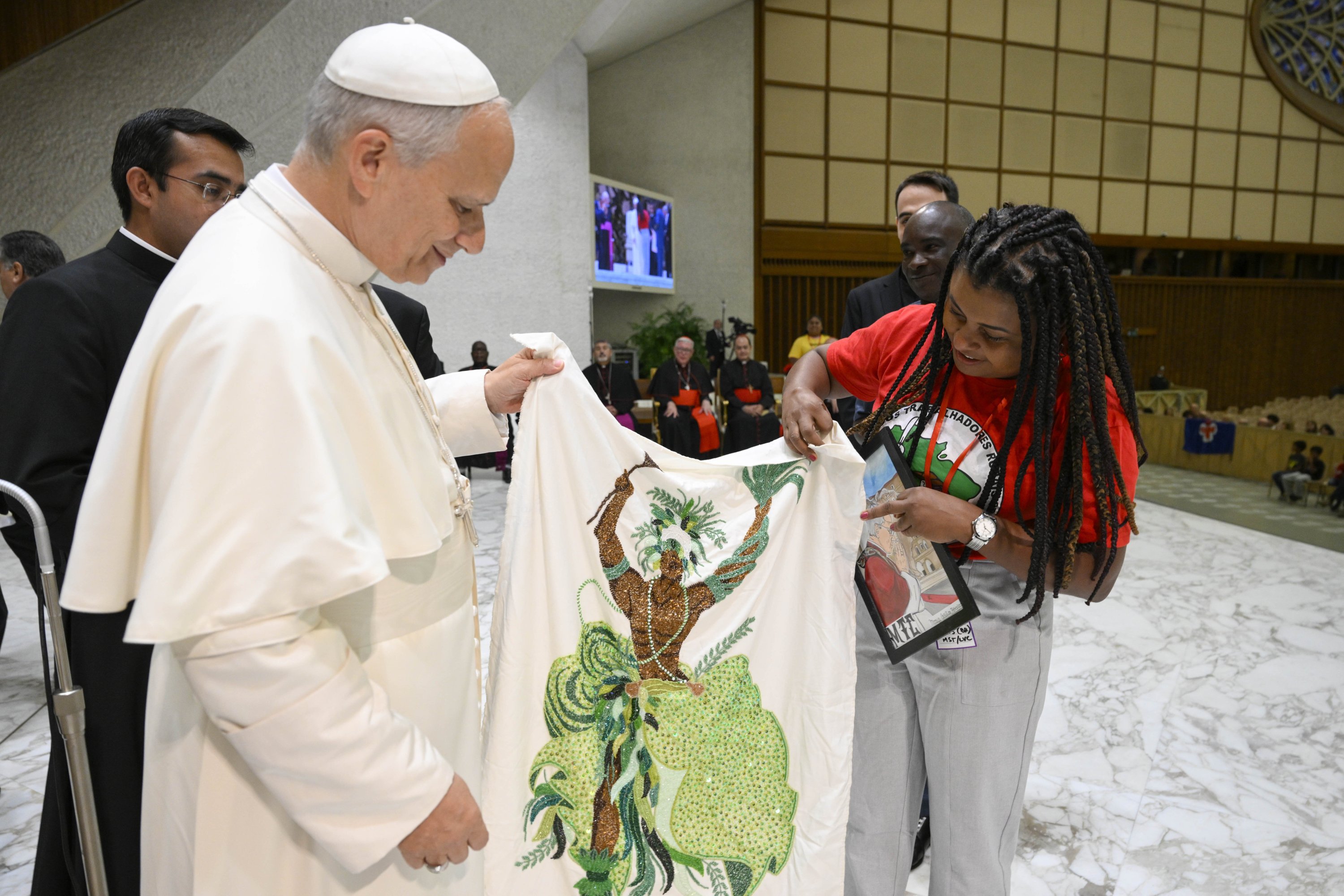 Pope Leo XIV meets with participants of the fifth World Meeting of Popular Movements on Oct. 23, 2025, in the Vatican’s Paul VI Audience Hall. / Credit: Vatican Media